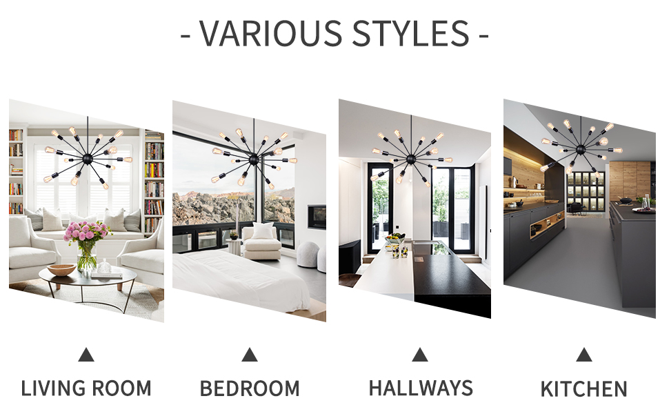 - 【Height Adjustable】 - This black hanging sputnik chandelier includes three separated rods, each rod is 9.84 inches, allows you to customize the desired hanging height. Total Hanging height of this 12 light sputnik light fixture- 29.52 inches.
